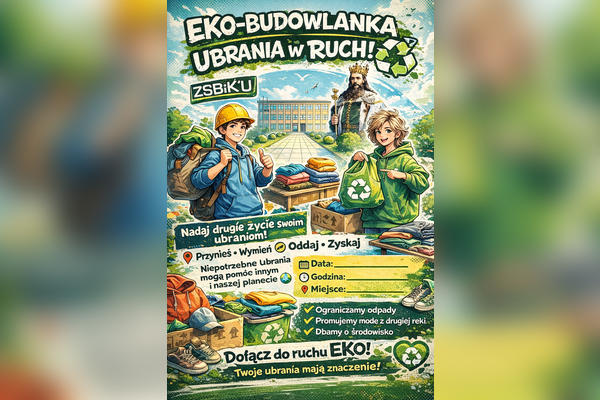 Eko-Budowlanka. Ubrania w ruch! to inicjatywa skierowana do uczniów, mająca na celu zbiórkę używanej odzieży. Uczestnicy przynoszą niepotrzebne, ale wciąż nadające się do użytku ubrania, które zostaną przekazane do ponownego użycia, recyklingu lub organizacji wspierających osoby potrzebujące.Kampania jest realizowna na terenie szkoły i promowana przez plakaty, media społecznościowe oraz działania informacyjne wśród uczniów i nauczycieli.
